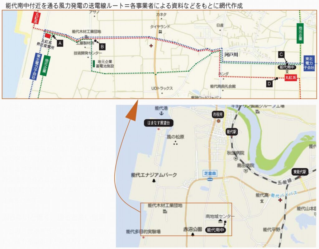 [3]秋田洋上風力発電株式会社。丸紅(筆頭株主)、大林組、東北電力、コスモエコパワーなど13社が株主。そのうち秋田銀行、大森建設など秋田県内企業が7社