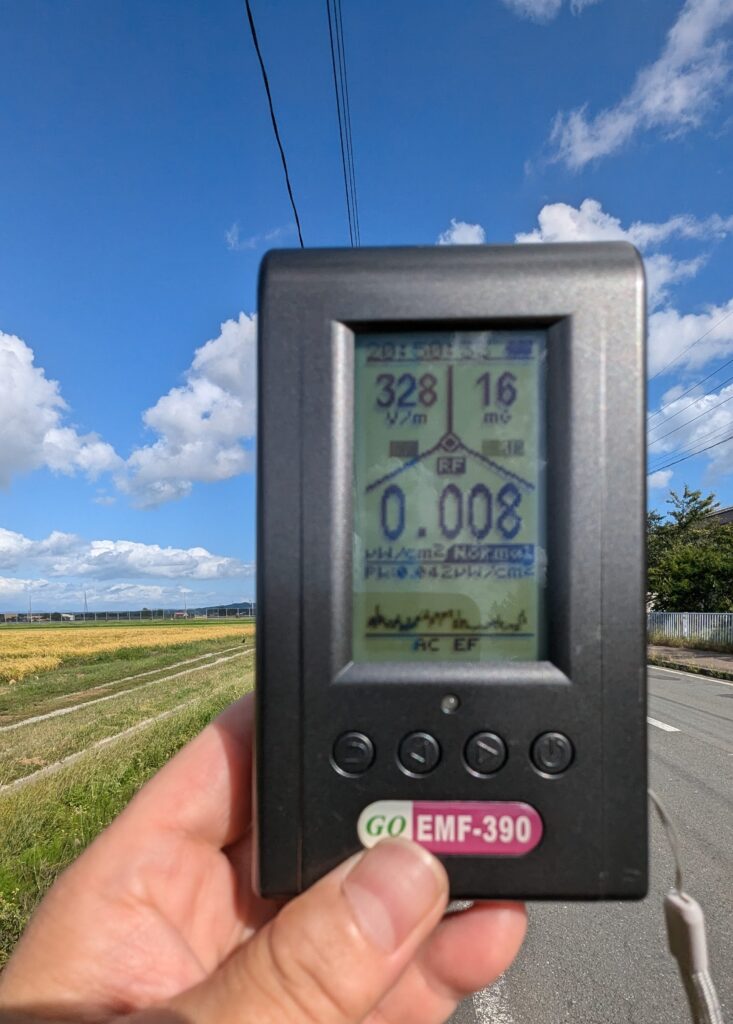 風力発電設備が多数立地する秋田県能代市で、設備で発電した電気を変電所へ送電する送電線が市内を通り、強い磁場が出ているとの情報を地元の方からいただきました。案内していただき私(網代)が測定したところ、市民が散歩やジョギングで利用する道で30μT(マイクロテスラ)、中学校の校門前の道路で2μTを超える、強烈な磁場が出ていました。