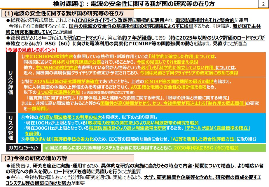 電波の「安全性」に関する研究については、国際非電離放射線防護委員会(ICNIRP)の動向を踏まえ、従来の「人体表面の体温の上昇」のみでなく、「痛覚閾値に関する研究」「深部体温上昇と健康への影響に関する研究」「眼球の損傷と機能に関する研究」を進めるべきとしています。これらは電波の熱作用・刺激作用による健康影響を研究対象とするものです。